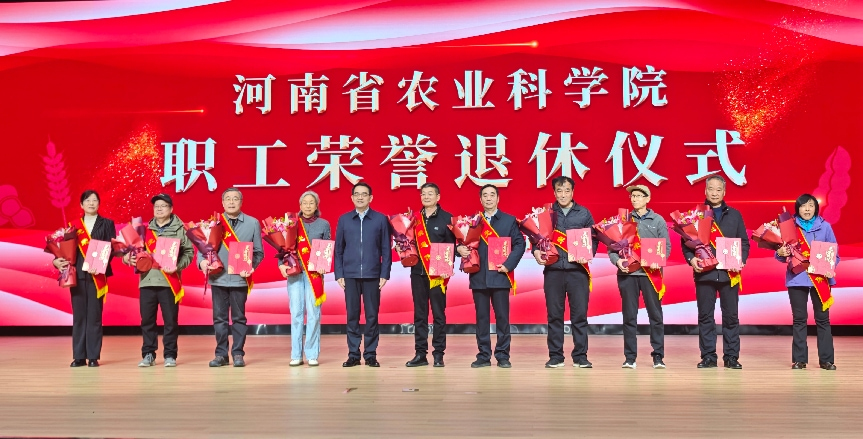 在荣誉退休仪式上,孙巍峰为退休干部代表颁发荣誉退休证书并送上鲜花,为院老科协授予“豫农银龄志愿服务团”团旗。